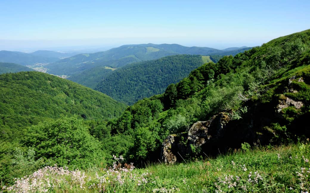 A stunning hiking area with open views over the Vosges mountain ridges and several accessible trails.